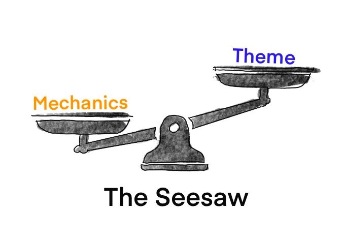 Now try changes that support the theme, first and foremost. It's not that you're ignoring your robust mechanics, but at the moment, you're more concerned with bringing the theme of your game to life. As you work and find changes that resonate, you can imagine the theme side of the seesaw getting heavier, lifting the mechanic side and making them more important again. When the thematic improvements to your game start getting difficult, it might be time to switch back to a mechanics-first lens. In this way you go back and forth, alternately looking at your game from one lens or the other, looking for changes that help the side you're currently most concerned with.